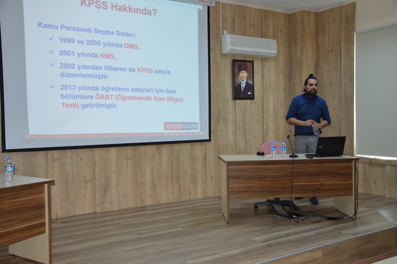 Okulumuz akademisyenlerinden Öğr. Gör. Necati AKYÜZ'ün DGS hakkındaki sunumuyla başlayan seminer, Pegem Akademi Alanya Şubesi yöneticilerinden Can BAYSAL'ın KPSS bilgilendirmesiyle devam etti. Sunumlar sonrası öğrencilerden gelen sorular konuşmacılar tarafından cevaplandı. Seminer sonrası yapılan çekilişle, öğrencilere Pegem Akademi tarafından çalışma kitapları hediye edildi.